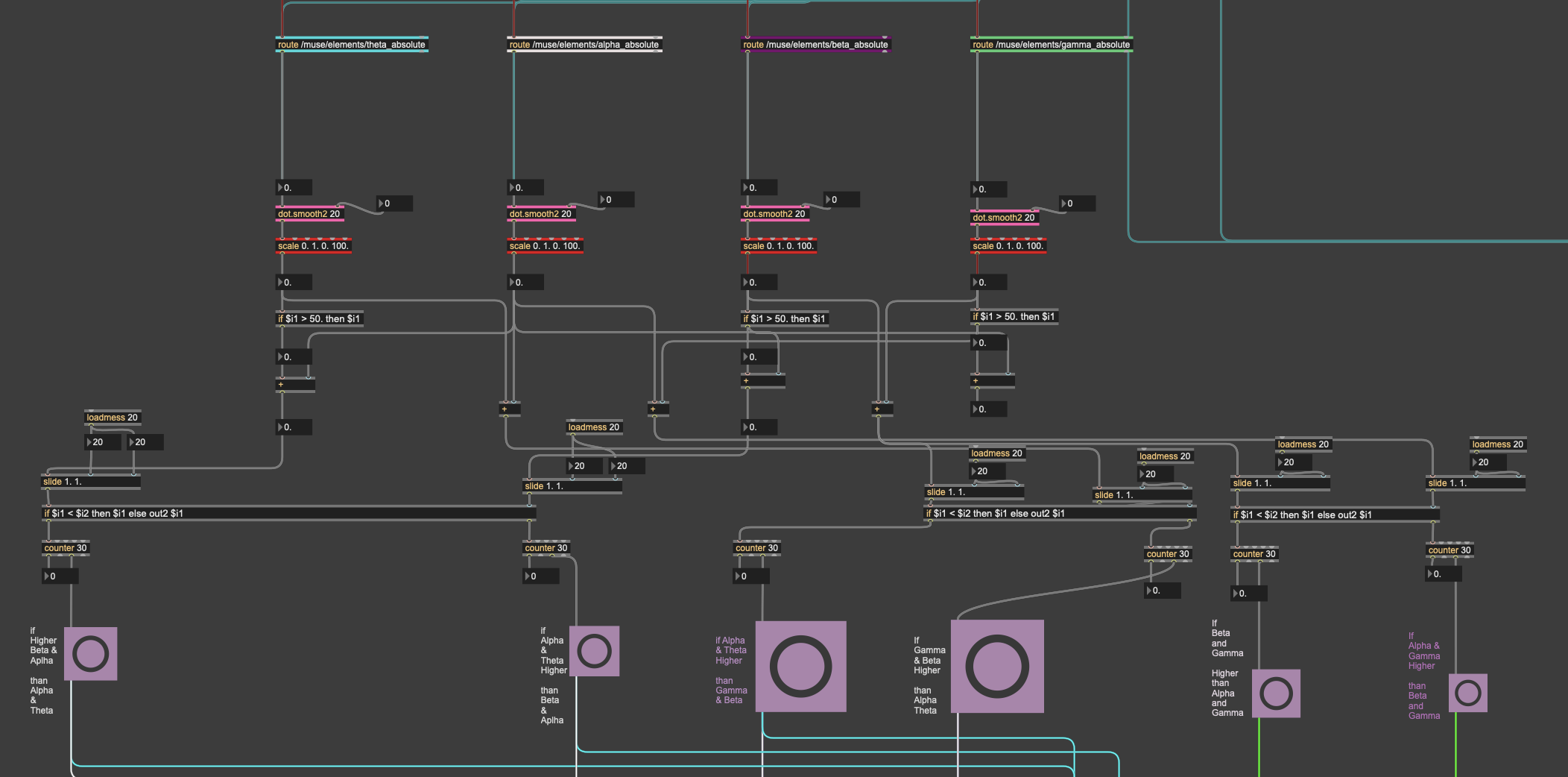 Crucially, Rustle also includes a visual layer: a video projection that evolves in tandem with the sonic and physiological transformations. The visual material—composed of abstract textures, environmental footage, and algorithmically generated imagery—reacts to both the sound and the affective states driving it. This is achieved through real-time processing in Max/MSP, which synchronizes video content with incoming EEG and HR data, allowing the visual narrative to unfold organically alongside the music. As the performer’s emotions shift, the video’s colors, rhythm, and shapes change too, blending sound and visuals into a unified, synaesthetic experience.