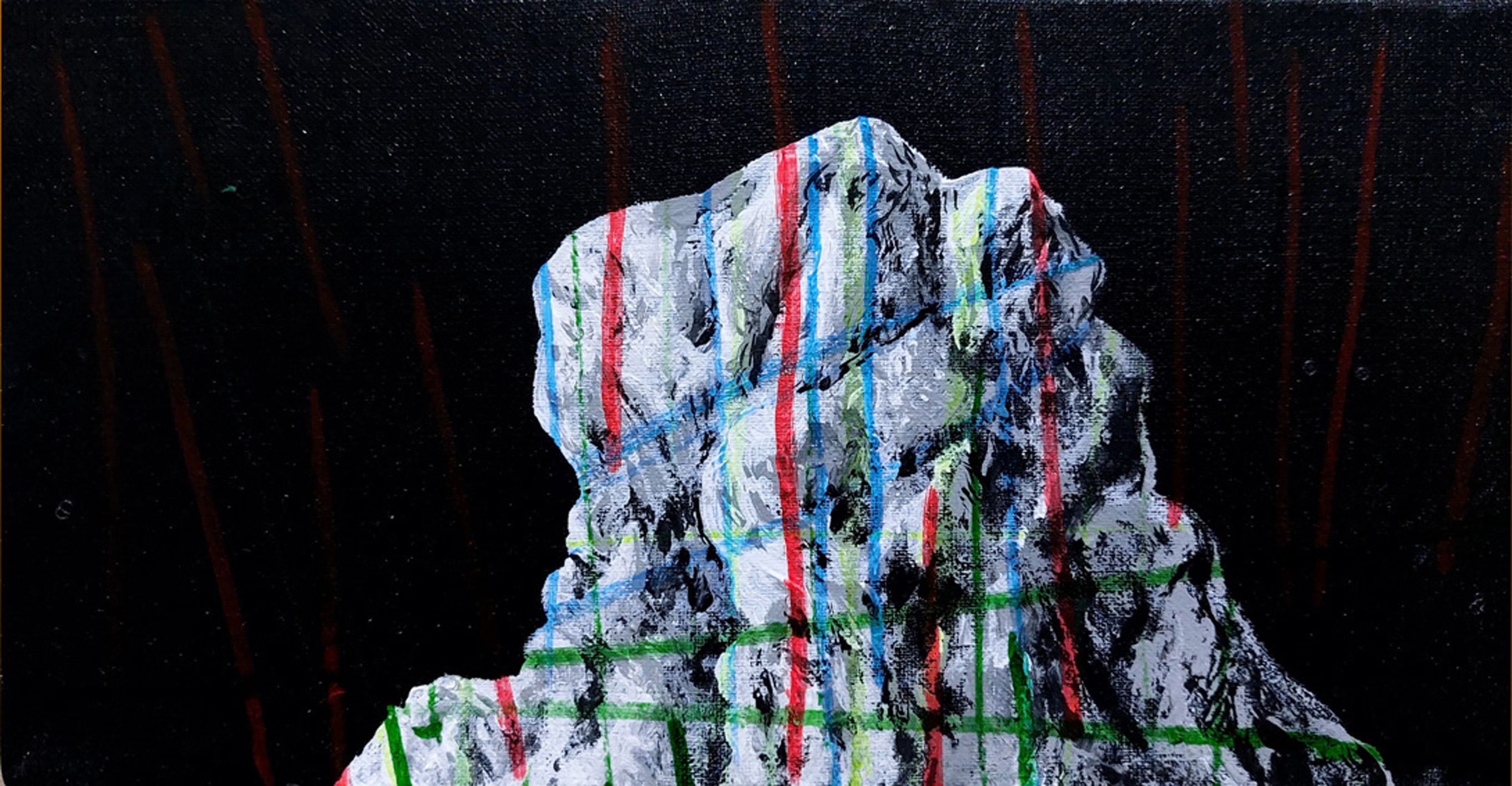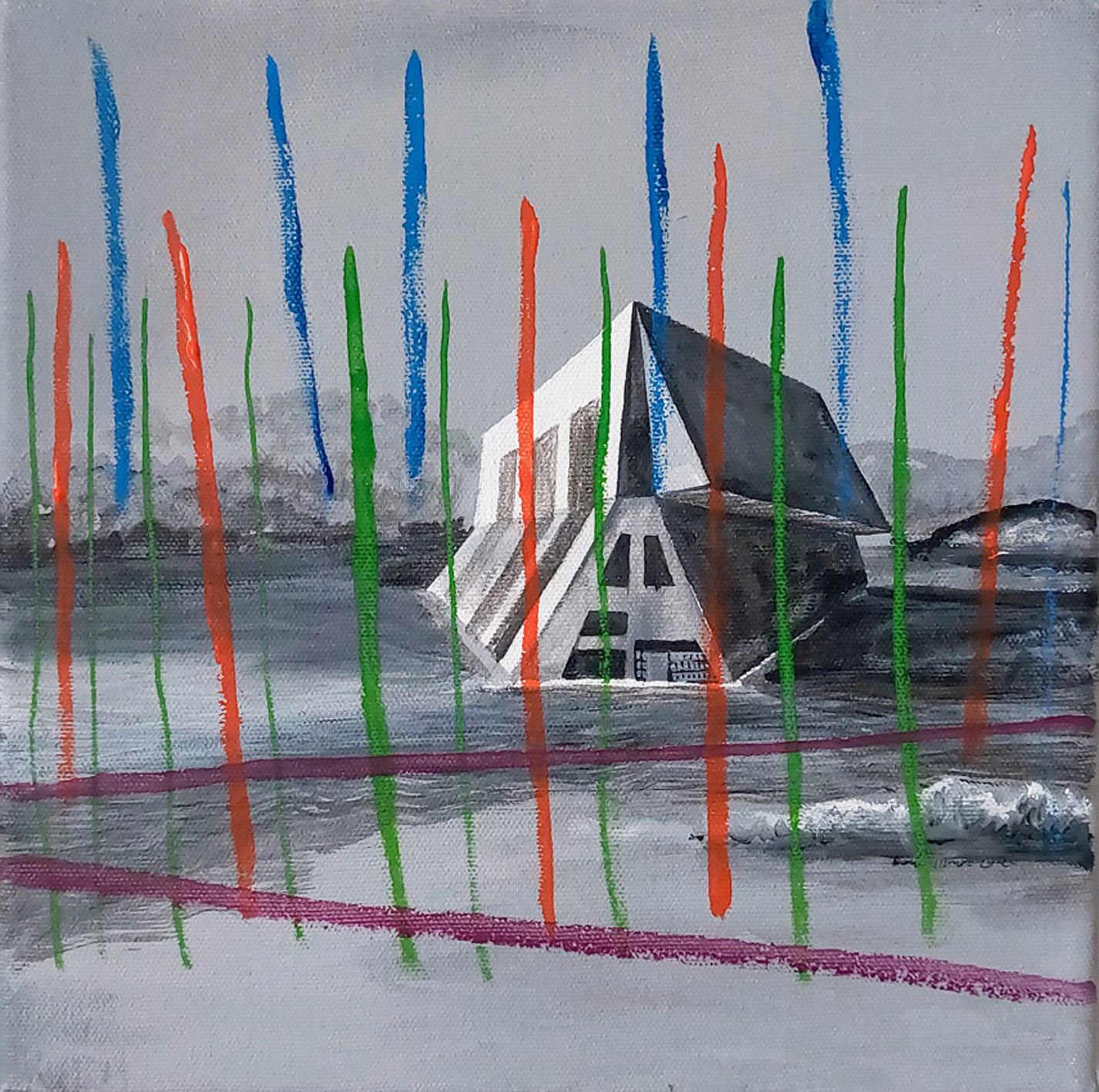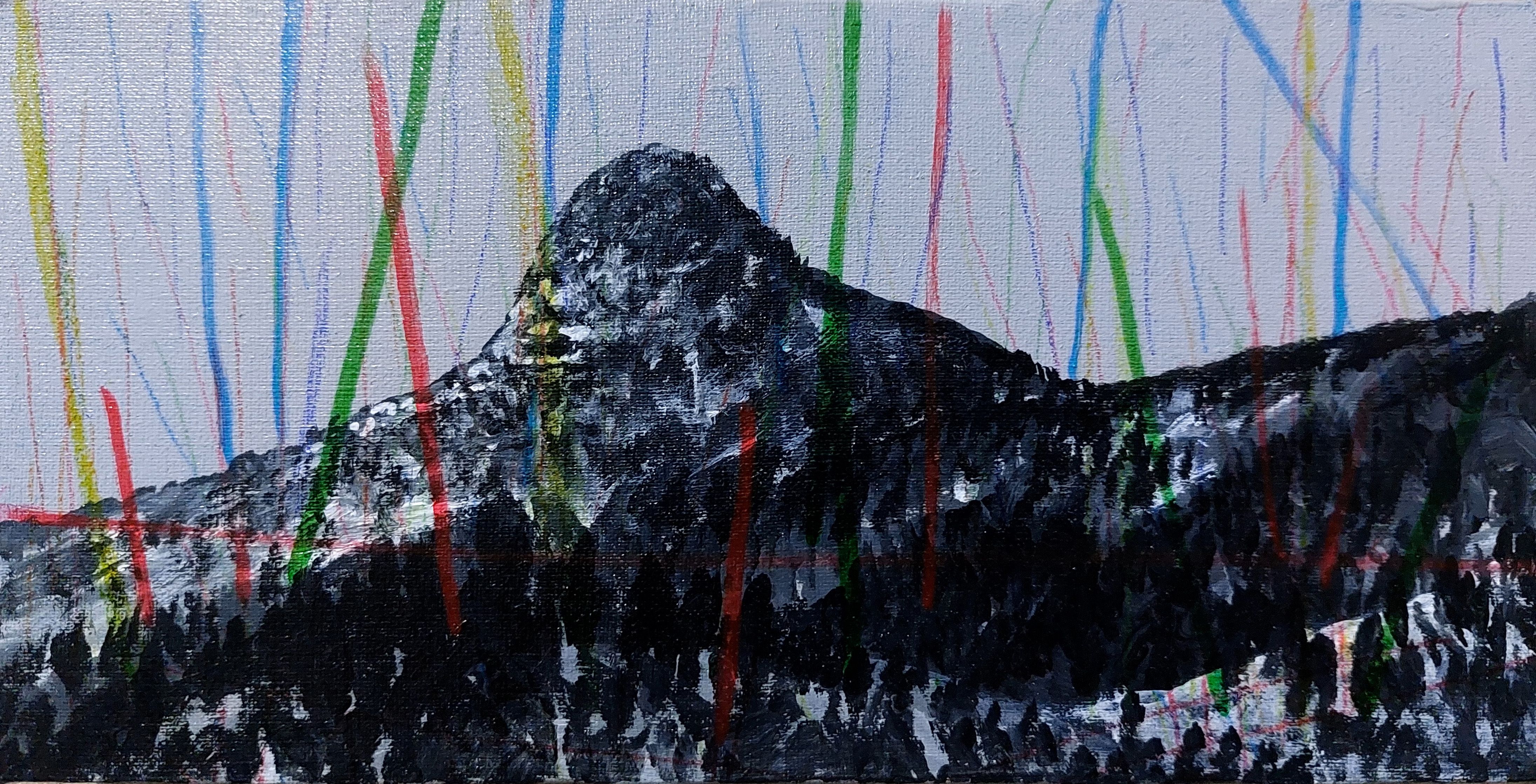Nicely executed canvas paintings with a play between black and white with coloured rain-like slashes. Play across depth. Good topic: colour perception.