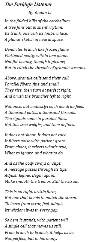 The Purkinje Listener brings the hidden beauty of the brain to life. Through the delicate branching of a single Purkinje cell, Youlan Li shows how the brain listens, filters, and adapts, turning complex neural processes into a meditation on learning, flexibility, and harmony. The poem transforms a microscopic structure into a symbol of patience and resilience, inviting readers to marvel at the intelligence woven into every cell. It is both a scientific insight and a poetic celebration, perfectly capturing the spirit of the competition.
