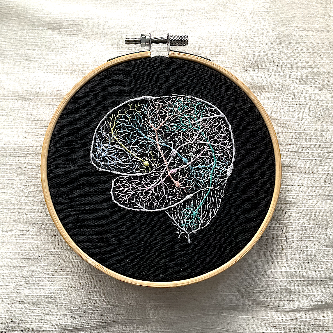 Pleasing embroidery. Image of brain transposed into craft associated with women. Softening neuroscience.