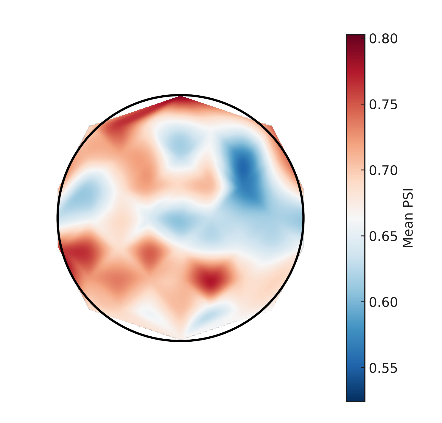 The average PSIs for each channel pair (put together to form a topographic map) becomes a guide of my trajectory, with me carrying light sticks to physically trace out the map. In regions of deep red — sites of high synchrony — my light-sticks glow and linger; in the cool blues of desynchronization, my form dissolves fleetingly into shadow.